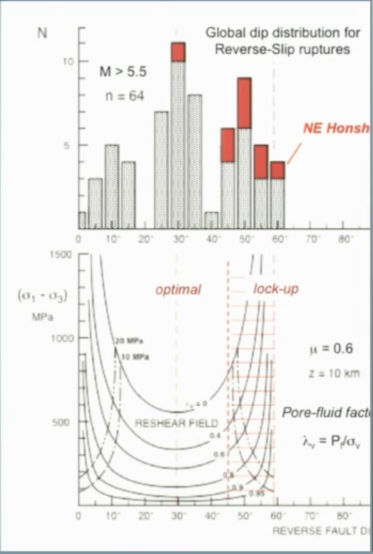 At θᴿ ≈ 60° to σ₁ (the frictional lockup angle for μ = 0.75), a fault cannot slip unless Pf reaches σ₃. The dip distribution of active reverse fault ruptures peaks at ~30° and extends to ~55–60°, with the high-dip cases implying λᵥ ~ 0.8–0.9. This is especially evident in northern Honshu, where compressional inversion forces rupture on inherited near-lockup normal faults — bright-spot reflectors and high-conductivity zones near hypocentres are interpreted as overpressured fluid arrays. Ninety percent of global seismic moment is released on subduction megathrusts where λᵥ ≥ 0.9–0.95; the overpressured fault is the global norm.
